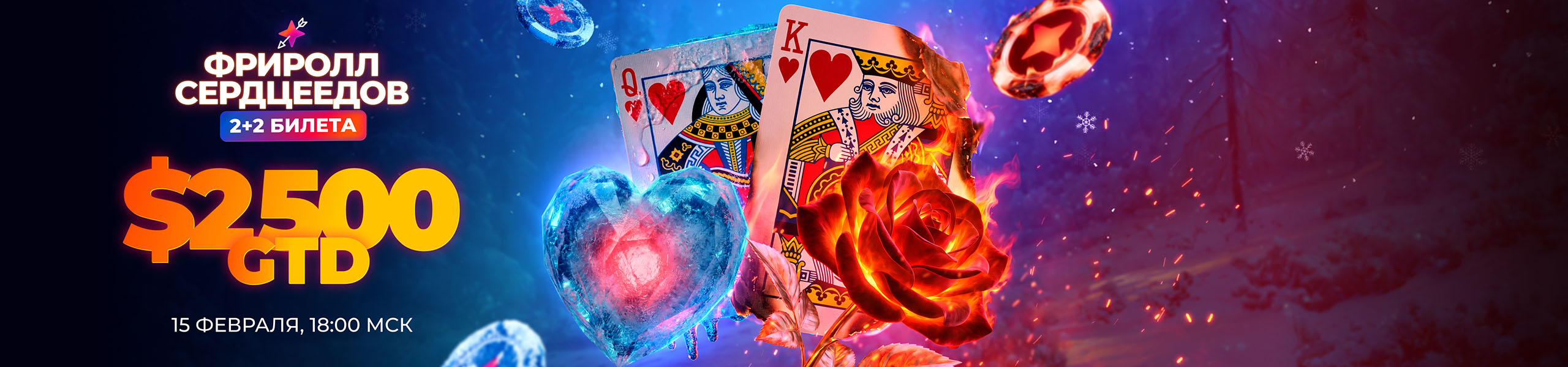 15 февраля в 18:00 МСКФриролл сердцеедов с гарантией $2 500. Это не просто турнир, здесь вы можете играть сразу несколькими стеками! Да-да, вы не ослышались! Разные стеки за разными столами и шанс на выигрыш в 4 раза выше!