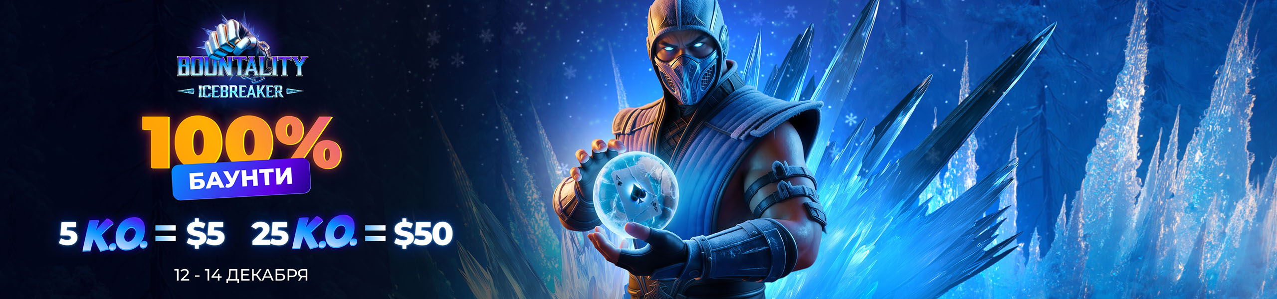 12-14 декабря — холодные выходные в стиле персонажа Mortal Kombat Sub-Zero! Три дня турниров в формате 100% Bounty с бай-инами от $5.5 до $25, где PokerPlanets доплачивает за точные “удары” по оппонентам. Каждые 5 нокаутов — дополнительные $5 от PokerPlanets.